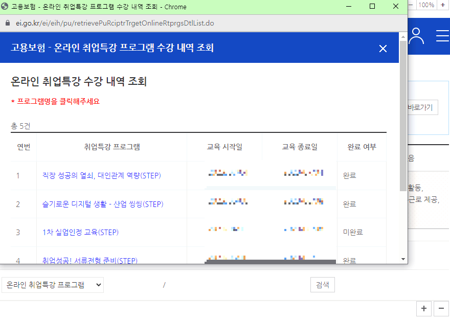 자 선택하세요에서 온라인 취업특강 프로그램을 선택하시고 검색하시면 내가 들었던 강의목록이 뜹니다 저기서 신청일마다 들었던 취업특강을 선택해 줍니다 중복선택은 절대 안 됩니다 1차 실업인정을 받으신 분은 1차 실업인정 교육(STEP) , 2회 차 3회 차 4회 차 실업인정받으신 분들은 신청일 때 들었던 수강을 선택하시면 됩니다 이러면 1~4회 차 실업급여 실업인정이 모두 완료가 되었습니다.