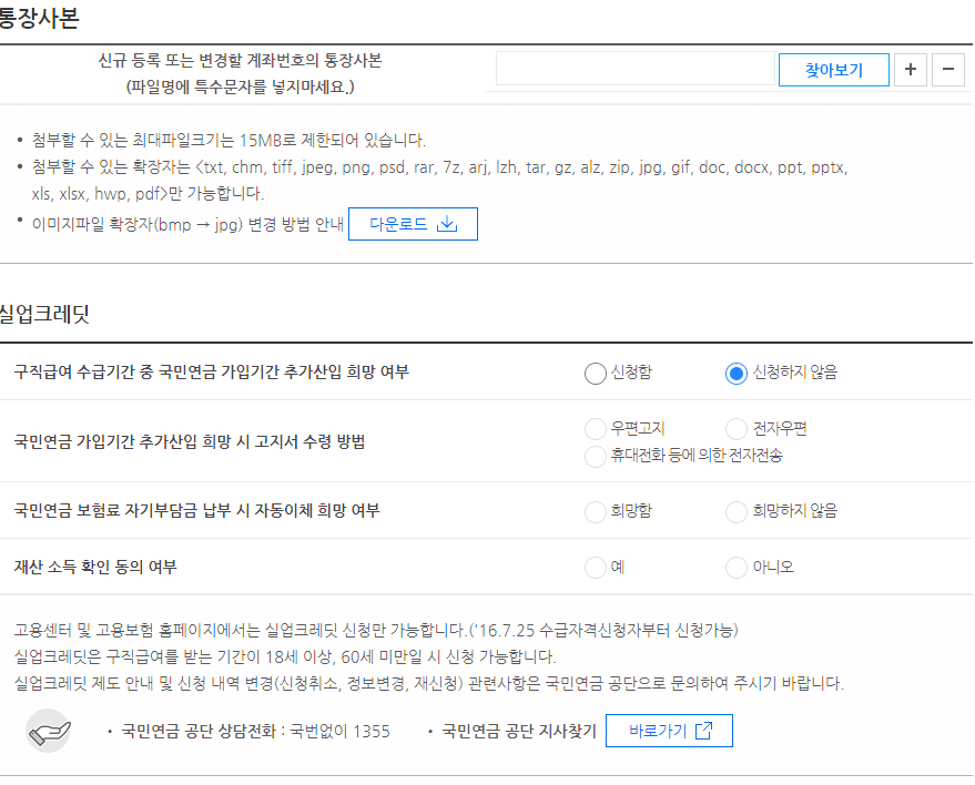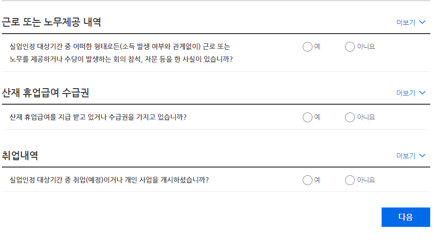 들어가시면 통장사본은 고용센터에서 제출하신 통장사본을 넣으시면 되고 근로 또는 노무제공내역 산재 휴업급여 수급권 취업내역은 지금 실업급여받으려고 하니깐 당연하면 안 되는 거겠죠? 아니요 체크하시고 넘어갑니다