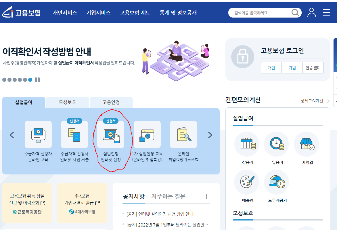 위 사진과 같이 로그인하시고 빨간색으로 칠한 실업인정 인터넷 신청을 클릭합니다