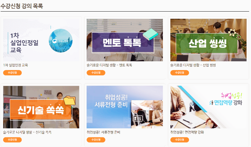 접속하시고 로그인하시면 수강목록이 뜹니다 저기서 1차 실업인정교육을 제외한 과정을 선택하셔서 들으시면 됩니다.